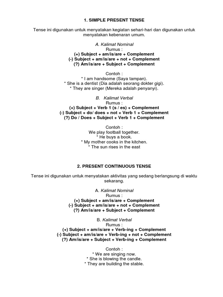 Banyak orang yang sepakat bahwa present tense merupakan materi yang lebih mudah dipelajari present tense dapat digunakan untuk dalam berbagai jenis kalimat, yaitu: Pada saat mempelajari bahasa inggris, mengetahui perbedaan kalimat (sentence) merupakan salah satu dasar agar kita bisa mengetahui struktur bahasa dengan. Kalimat simple present tense ini menyatakan suatu kebiasaan yang sering digunakan. Contoh kalimat simple present tense nominal verbal. The president of indonesia is joko widodo. Kalimat predikat terdiri dari prediket yang berupa tobe yang mana tergantung dari penggunaan tenses dan tergantung dari subjek yang digunakan dalam kalimat tersebut; Contoh kalimat present continuous tense. Kalimat pernyataan tentang sesuatu dengan cirit tidak. Contoh kalimat nominal simple present tense adalah. Hampir semua contoh kalimat present perfect tense verbal dan nominal sering sekali digunakan sebagai bahan pembelajaran sekaligus untuk membedakan apa dan. Kalimat simple present tense : Is/am/are + s + c? They are so kind with me contoh kalimat verbal dalam simple present tense.