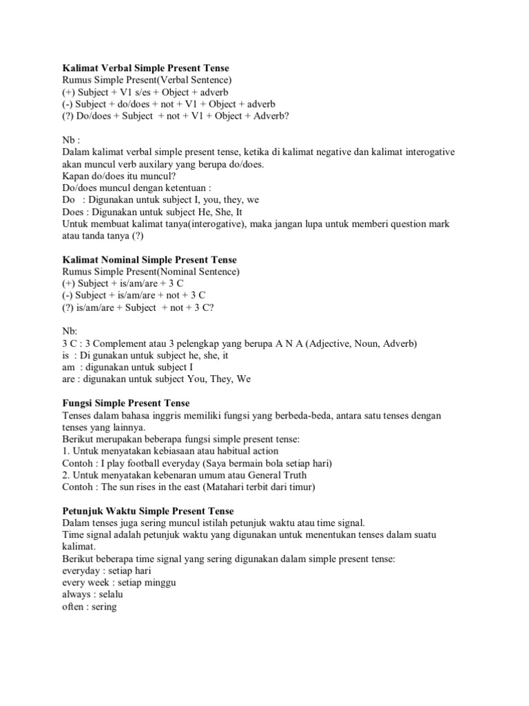 Kalimat predikat terdiri dari prediket yang berupa tobe yang mana tergantung dari penggunaan tenses dan tergantung dari subjek yang digunakan dalam kalimat tersebut; Contoh kalimat verbal simple present contoh paragraf simple present tense. The president of indonesia is joko widodo. Ada 40 contoh kalimat positif simple present tense. Simple present tense (nominal) lengkap pengertian, rumus dan contoh.